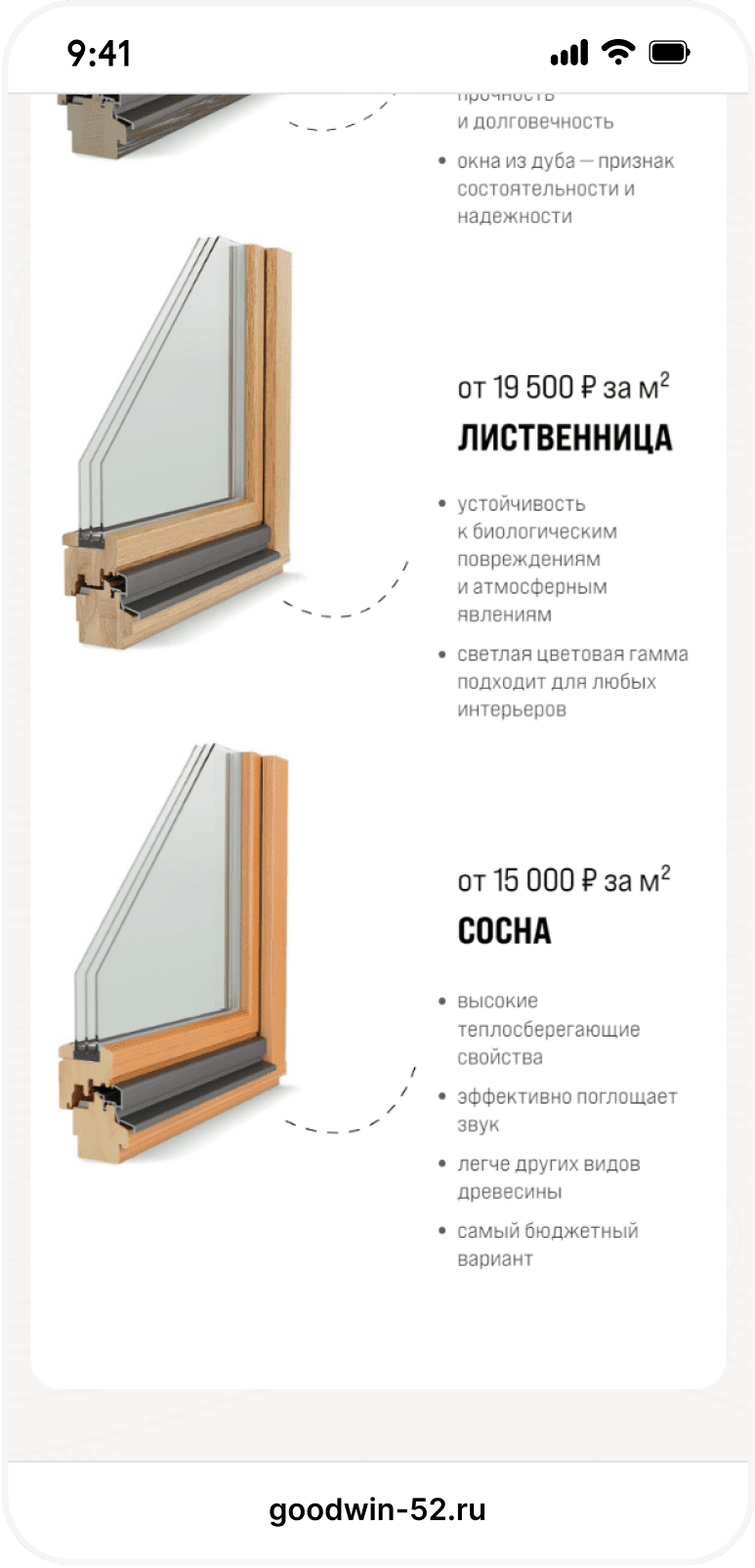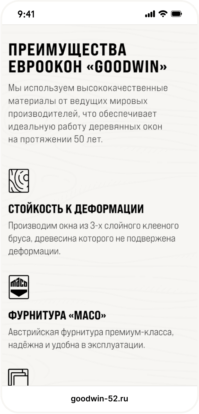 Компания занимается производством и монтажом деревянных евроокон. Команда Goodwin изготавливает окна на собственном заводе и полностью контролирует качество изделий.